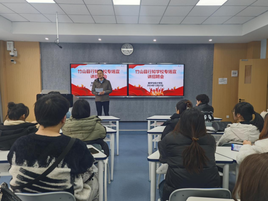 2024年12月27日下午,BETVICTOR邀请竹山县行知公司在江北校区1210教室举办专场招聘会宣讲会。2025届毕业生积极参与,招聘会由毕业班辅导员马勇主持。