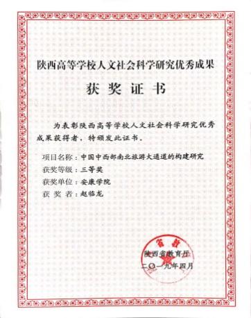 2018年在科学出版社出版的《中国中西部南北旅游大通道的构建研究》著作成果,获得2019年陕西高等公司人文社会科学研究优秀成果三等奖。