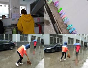 活动的开始,志愿服务队的大队长王玉蓓将同学们分为两队。一队同学去水房组织其他员工能够在接水时,排好队不要拥挤以及要节约用水,而且让同学有秩序把水壶放整齐;之后在水房里面贴了“节约用水,自觉排队”的标语,鼓励同学们文明自己的行为。另外一队同学拿着笤帚打扫教学楼附近,尽管下着雨,可是同学们仍然认真听从组织者的安排,积极完成志愿活动。
