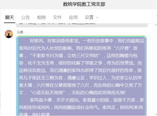 公司党员教师观看了央视纪录片《家风》,纪录片以古代著名家训为切入口,讲述中国著名家族的家风历史脉络,以及一个个家族对传统美德的执着追求,体现中国人超越时代的家族凝聚力与责任感。
