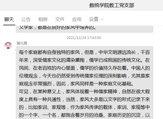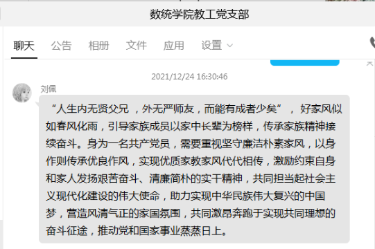 王彦海表示:“家是小细胞,国是有机体,国是千千万万家的依靠。国、家、个人都是一个密不可分的整体,只有强的国,才能有富的家。家是人生开始的地方,是一个人精神成长的沃土。因此,党员更要注重家庭教育,家风是道德的自觉和传承。对党员家庭而言,家风如何不仅关系到家运族脉,还可能对党风、政风和社会风气产生一定的影响。作为教工党员,理应严格自律,管好自己,约束亲属。作为高校教师,既要重视专业课教学,还应重视课程思政,为人师表,教书育人!”