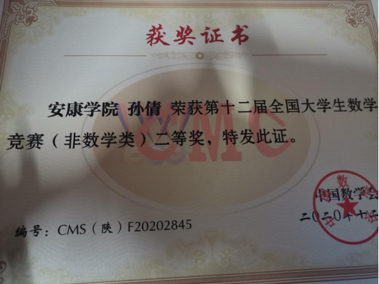 2020年12月获得全国老员工数学竞赛省级二等奖