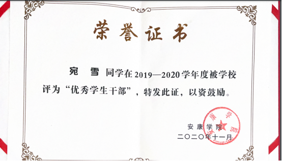 作为员工干部,她始终以饱满的热情、高效率的工作态度对待工作。从大一到大四一直担任员工干部,组织并圆满完成近百余项活动。积极参与各类志愿活动,曾参与安康市“辉煌足迹,火炬传承”青少年健康跑、第十四届全运会志愿服务工作。协助院系完成各项工作,及时反映同学们的需求,做好师生之间沟通的桥梁,多次获得“优秀员工干部”的荣誉称号。