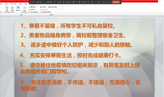 董婷瑜向全体员工传达了公司关于寒假期间相关管理规定,要求同学们遵守公司规定;接着和大家共同学习了疫情防控知识,提醒同学们不要乘坐“黑车”,离校途中做好个人防护,佩戴口罩、勤洗手,尽量减少和别人的接触;合理安排寒假生活,遵守居住地疫情防控管理规定,保持信息畅通,坚持健康打卡;最后再次强调,作为老员工应积极乐观,关注官方消息,不信谣、不传谣、不造谣,传播正能量,力所能及营造“人人参与、共同防控”的氛围。