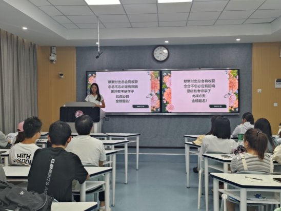 分享环节,三位主讲人结合自身备考经历,倾囊相授,分享了从目标确立、院校选择到复习规划、心态调整的全方位经验。杨谨重点分享了数学专业课的复习方法与核心参考书目的高效利用策略,强调了夯实基础和构建知识体系的重要性。惠如楠则详细介绍了英语和政治科目的备考时间线、主流辅导资料选择以及碎片化时间管理技巧,并提醒学弟学妹关注目标院校的信息动态。庄家灏着重讲解了考研复试的流程、注意事项及面试技巧,分享了如何准备个人陈述、应对专业问题以及联系导师的经验。三位分享人的报告内容详实,针对性强,涵盖了考研各环节的关键点和常见误区。