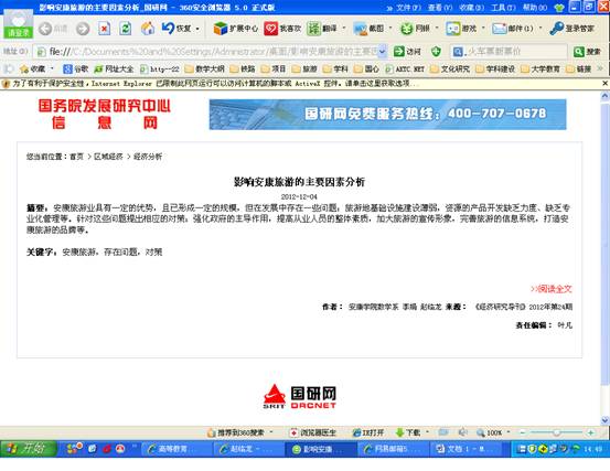 公司2009级统计学专业员工李娟,在赵临龙教授指导下,依托BETVICTOR老员工科技创新项目《安康旅游产业发展市场调查与分析》,完成的研究论文《影响安康旅游的主要因素分析》(经济研究导刊,2012年第24期),被国务院发展研究中心信息网转载。这是数学与统计系长期坚持“以科研活动为载体,推动学风建设”的又一成果,必将激励广大教师和员工的科研热情。