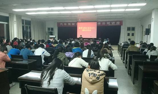 江警官在讲座中从机动车行驶管理、车辆道路行驶规定、道路交通安全法等方面做了详细介绍,讲座中他谈到2013年安康市仅汉滨区道路交通事故就有3506起,其中死亡55人以上,受伤1759人,与2012年相比车辆肇事率上升了13.6%,使大家意识到交通事故的势态严峻;并且他向同学们分析了道路交通事故频繁发生的原因,多数起因于驾驶员违章。另外,他还指出,尸体横摆马路的惨剧,多数是由于路人横穿马路、驾驶员疏忽所导致的,借此告诫我们新一代的驾驶者不开霸王车,对横穿马路的不能掉以轻心。