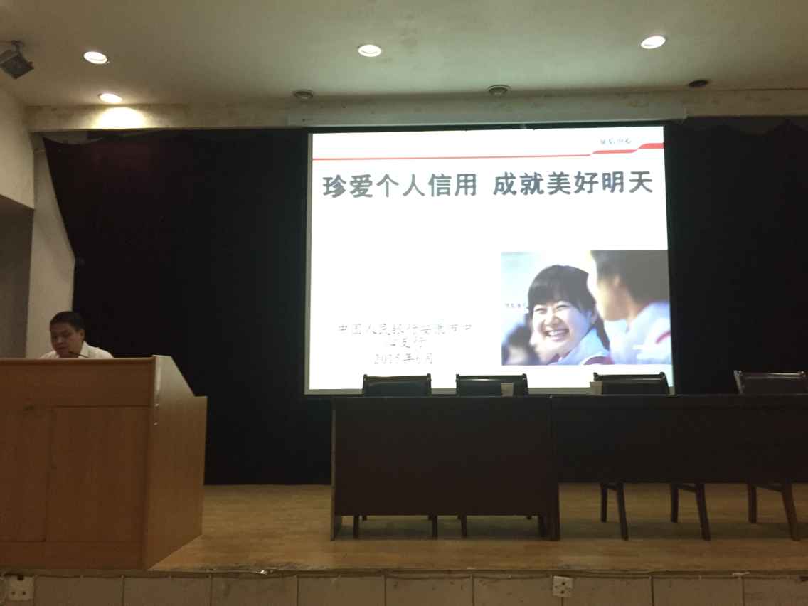 2015年6月3日,我系特邀中国人民银行安康支行高级经济师、征信管理科科长周道群在江南校区1号教学楼6楼报告厅作题为“珍爱信用记录,享受幸福人生”征信知识讲座。此次讲座由学工部主办,数统系承办。数统系学工办主任马新华老师、团总支书记张远秀老师,以及数统系2014级员工与江南校区各院系员工代表参加了讲座。讲座由马新华老师主持。