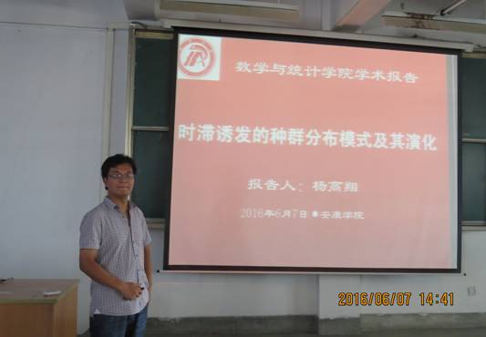 6月7日下午2:30在1号教学楼1510教室,杨高翔博士应邀为公司师生做了题为 《时滞诱发的种群分布模式及其演化》的报告。该报告主要以种群个体相互作用的时空滞后效应为主线,报告了时滞因素对种群的分布模式及其演化的影响,特别是对维持种群的稳定性具有重要意义的非均匀分布的影响,其结果具有重要的理论意义和应用价值。