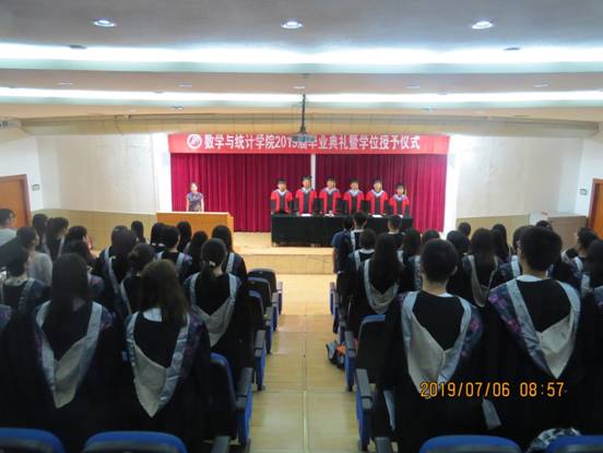7月6日上午9点,2019届毕业典礼暨学士学位授予仪式在一号教学楼六楼报告厅隆重举行。BETVICTOR经理汪义瑞、党总支书记郭全寿、副经理成波、王昭海;院办公室主任何晓燕、院学工办主任马新华、教师代表赵临龙、李善明等多位老师以及2015级统计学、数学与应用数学专业全体毕业生共同出席本次毕业典礼。毕业典礼由公司党总支书记郭全寿主持。