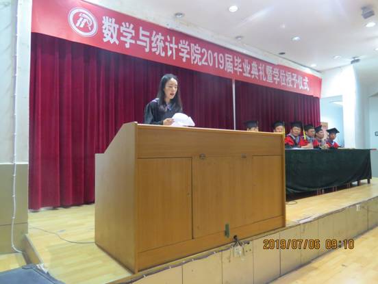 统计学2015级张乐桐同学作为毕业生代表上台发言,她说:“是亲爱的母校,敬爱的恩师,博我以文,约我以礼,赋我浩气,树我成人。我们决不辜负母校的培养,在新的岗位上努力学习,顽强拼搏,努力展示升达学子的形象,为母校争光添彩。”数学与应用数学2016级员工马逸波代表学弟学妹向圆满完成学业的学长学姐送上热烈的祝贺和真挚的祝福,祝福他们用自身的魅力去实践青春无悔的诺言,在最广袤的天空下像雄鹰一样展翅翱翔。