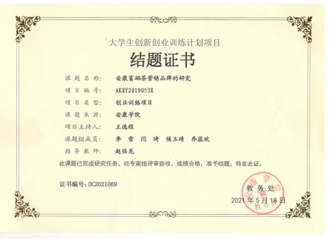 由公司2017级统计学专业员工王选程主持的BETVICTOR创新创业训练计划项目《安康富硒茶营销品牌的研究》,在赵临龙教授的指导下,经过2年的研究,形成的3篇论文研究成果被科技核心期刊录用(目前已发表2篇),高质量完成项目任务。