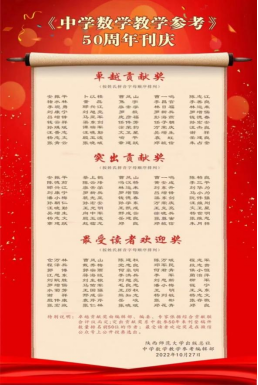 2022年,陕西师范大学创刊的《中学数学教学参考》期刊办刊满五十周年。《中学数学教学参考》在全国开展五十年刊庆征集活动,其中评选出卓越贡献奖50名、突出贡献奖50名、最受读者欢迎奖50名。