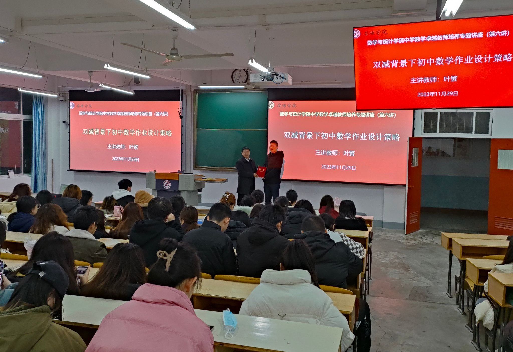 2023年11月29日,BETVICTOR于江南校区1510教室举行中学数学卓越教师培养专题讲座第六讲。此次讲座由安康市教学研究室中学数学教研员、德育部主任叶繁老师主讲,此次报告以“双减背景下初中数学作业设计策略”为主题,讲座由副经理徐龙华主持。