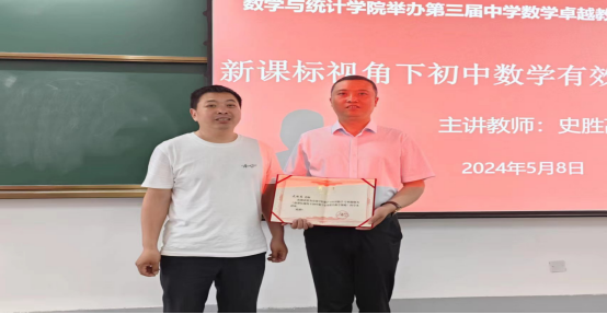 史胜高老师通过一系列丰富而经典的案例,结合通俗易懂的讲解方式,为同学们呈现了一场别开生面的专题讲座。这次讲座不仅让同学们收获颇丰,更对师范生提高中学数学教学能力具有关键的指导价值,为他们在未来成为一名卓越的人民教师奠定了坚实的基础。讲座最后,徐龙华为史胜高老师颁发聘书,并合影留念。