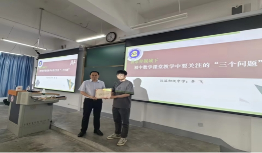 李飞老师从学科育人、教学设计、解题能力三个方面,提出初中数学课堂教学中需要注意的三个问题,利用具体的例子,让同学们更能体会数学学科育人的价值,理解教学设计中教学逻辑的构建,教学素材的改造以及教学问题的设计,最后,李飞老师强调作为老师解题能力的重要性。