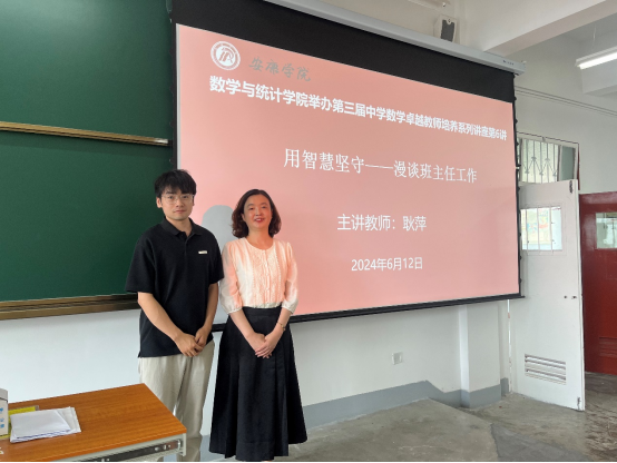 2024年6月12日,BETVICTOR于江南校区1510举办了第三届中学数学卓越教师培养专题讲座第五讲。特别邀请陕西省骨干教师、汉滨高中高级教师、汉滨区优秀班主任称号获得者耿萍老师为中学数学卓越教师培养班员工带来以《用智慧坚守——漫谈班主任工作》为题的报告,鲁星星老师主持此次讲座。