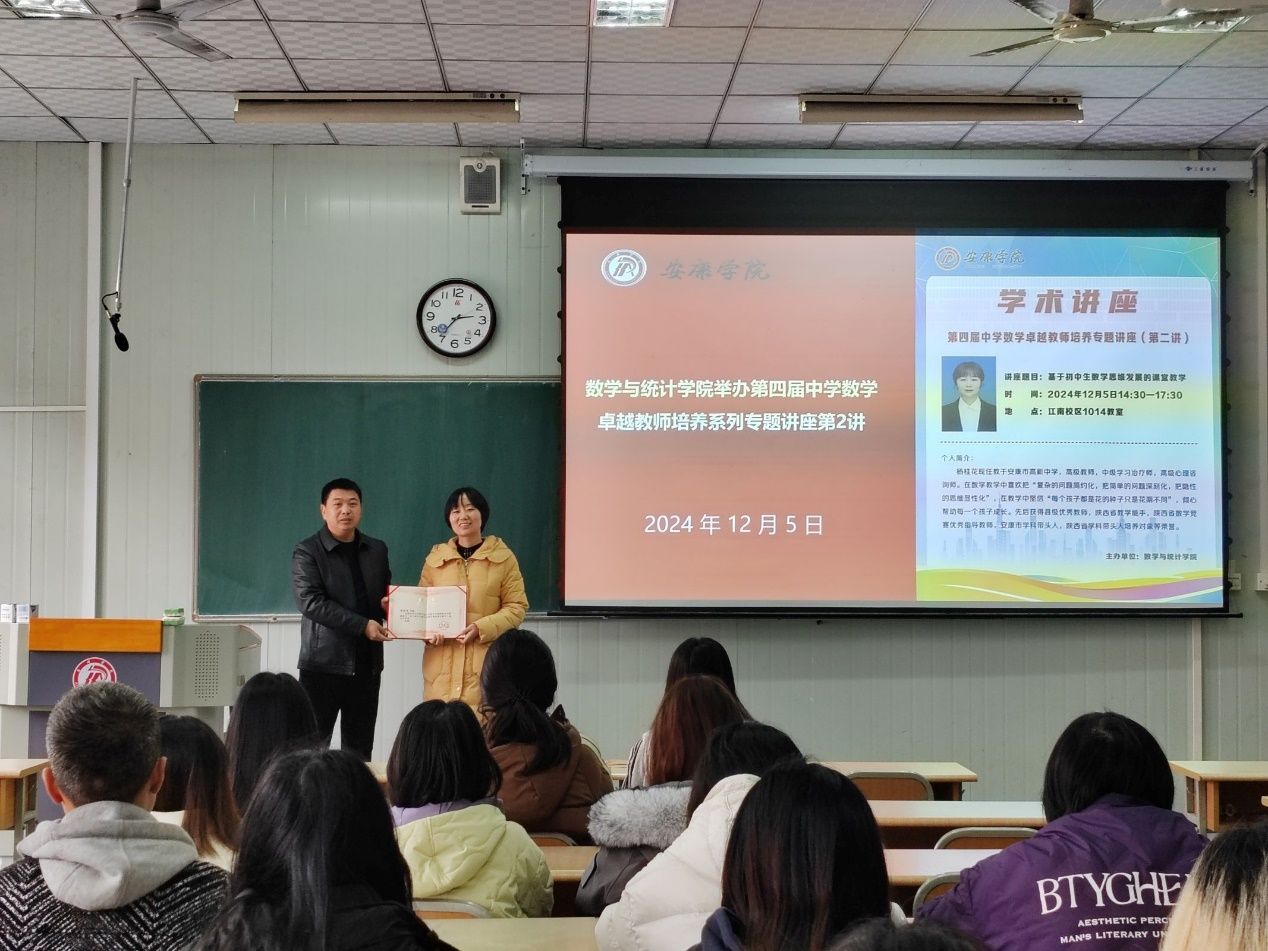 2024年12月5日BETVICTOR举办第四届中学数学卓越教师培养系列专题讲座第二讲。特邀请安康市高新中学高级教师、中级学习治疗师、高级心理咨询师、县级优秀教师、陕西省教学能手、陕西省数学竞赛优秀指导老师杨桂花为卓越教师班同学做了题为《基于初中生数学思维发展的课堂教学》的专题讲座。BETVICTOR副经理徐龙华主持本次会议,并为杨桂花颁发聘书。