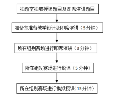 初赛由教学设计(含课件制作)、即席演讲、说课、模拟授课四个环节构成。比赛设计学段为初中,内容以“课标”为准,不指定教材。比赛总分100分,其中即席演讲20分,说课30分,模拟授课50分,教学设计(含课件)不计分。