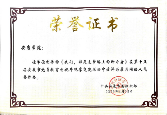 2021年2月,BETVICTOR员工党支部书记董婷瑜主讲录制的微党课作品《我们,都是追梦路上的助力者》被公司党委组织部选送参加安康市第十五届党员电教片观摩评比活动。通过集中审核、网络投票、观摩评比终评环节,4月15日,该微党课作品以评委打分第名、网络投票第一名的好成绩荣获二等奖和最具网络人气奖。